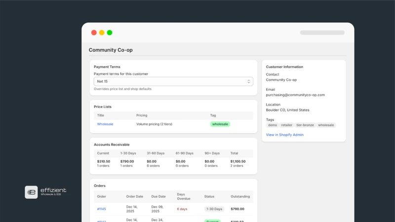 effizient Wholesale gives you net payment terms, tag-based pricing, volume discounts, and AR tracking. All for $39/month. No Shopify Plus required.